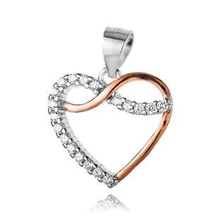 Stříbrný přívěšek zdobený ve tvaru srdce s motivem ležaté osmičky - nekonečna v barvě růžového zlata Přívěšek je vyroben ze stříbra s jakostním označením 925-1000 s povrchovou úpravou rhodium Rhodium patří mezi drahé kovy, patřící do skupiny platinových, chrání stříbro před černáním a zvyšuje lesk sříbrných šperků. Přívěšek je dodáván v papírové dárkové krabičce Parametry materiál stříbro (Ag 925-1000) povrchová úprava rhodium, růžové zlato druh kamene zirkon rozměr srdíčka 15 x 14 mm celková výška přívěšku 19 mm hmotnost 1,09 g
