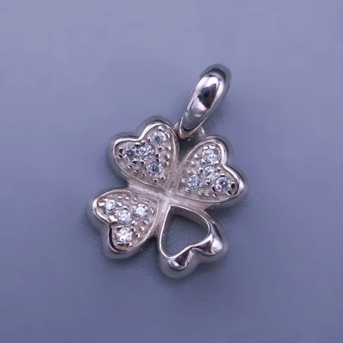 Moderní dámský stříbrný přívěsek na krk - čtyřlístek. Přívěsek je drobný, decentní a hodí se pro každodenní nošení. Je zdoben čirými třpytivými kamínky, které mu dodávají luxusní vzhled. Čtyřlístek je symbolem štěstí a lásky. Šperky se symbolem čtyřlístku jsou skvělým dárkem pro každou ženu.