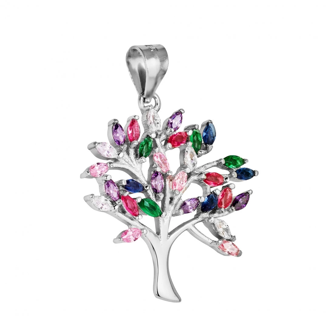 Stříbrný přívěšek s motivem strom života. Přívěšek je zdoben barevnými zirkony