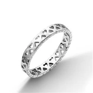 Stříbrný prsten po svém obvodu dekorovaný vyraženým motivem srdíček Prsten je vyroben ze stříbra ryzosti 925-1000 s povrchovou úpravou rhodium Rhodium patří mezi drahé kovy, patřící do skupiny platinových, chrání stříbro před černáním a zvyšuje lesk sříbrných šperků. Parametry materiál stříbro (Ag 925-1000) povrchová úprava rhodium šíře prstenu 3,2 mm Vyberte variantu: 54 58 62