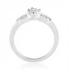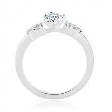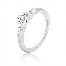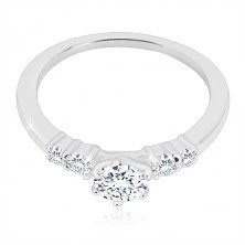Stříbrný prsten 925 - plochá lesklá ramena, kulatý zirkon v kotlíku a čtyři zirkony menších velikostí. Valikost 56