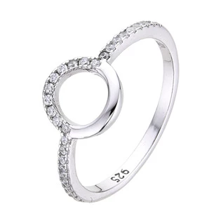 Zajímavě řešený stříbrný prsten s motivem kolečka zdobeného zirkony čiré barvy