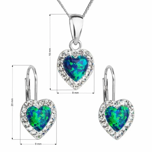 Sada obsahuje visací náušnice a řetízek s přívěskem ve tvaru srdíčka. Šperky jsou vyrobeny ze stříbra ryzosti 925/1000, které prošlo povrchovou úpravou rhodiem. Rhodium chrání šperk proti zčernání, zežloutnutí i poškrábání. Přívěšek i náušnice jsou zdobeny zeleným syntetickým opálem, který je navíc olemován ještě malými třpytivými Preciosa krystalky v bílé barvě. Náušnice mají zapínání na klapku. Jelikož šperky neobsahuji žádný přídavek niklu, mohou je bez obav nosit i alergici.