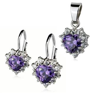 Sada stříbrných náušnic a přívěšku ve tvaru srdíček osázených čirými a fialovými zirkony