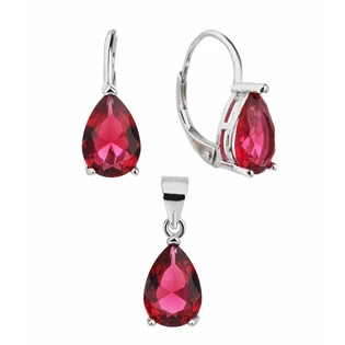 Stříbrná souprava šperků se skládá z náušnic a přívěšku dekorovaných červenými zirkony ve tvaru kapky