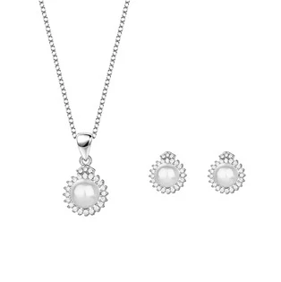 Stříbrná souprava šperků se skládá z náušnic a náhrdelníku dekorovaných čirými zirkony a přírodní perličkou