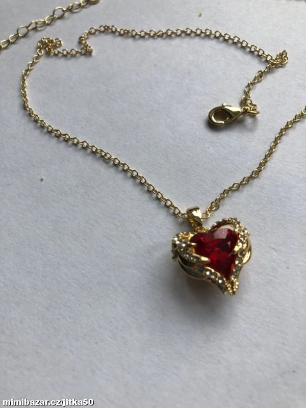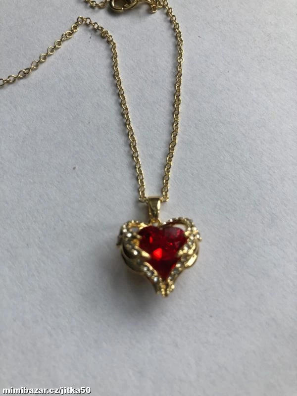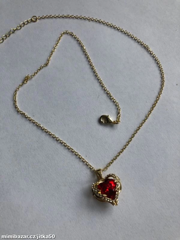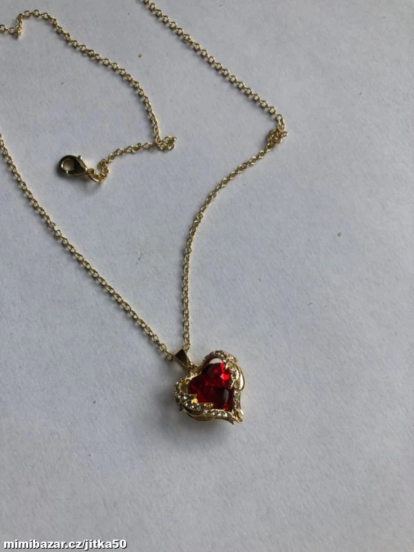 Krásný zlacený řetízek dekorovaný červeným kamenem ve tvaru srdce s čirými jemnými zirkonky