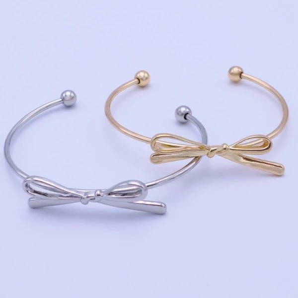 Zlacený a stříbřený náramek s mašličkou. Průměr náramku je 6cm, náramek je pružný a snadno se navlékne na ruku. Velikost mašličky - 38 x 10 mm Bižuterie bez niklu BZ04