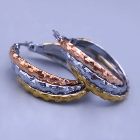 Nádherné dámské náušnice z chirurgické oceli - trojité kruhy. Náušnice jsou vyrobeny v moderní kombinaci tří barev - zlatá, stříbrná a rosegold. Jsou střední velikosti (průměr kruhu 30mm) a skvěle se hodí na párty, večírky, plesy i každodenní nošení. Tyto kruhové náušnice ocení především milovnice moderních a výrazných, přesto decentních šperků.