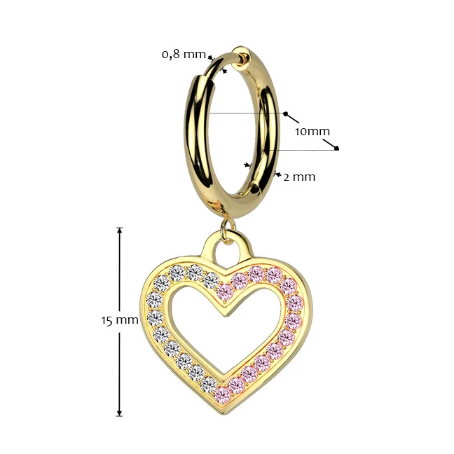 Ocelové kruhové náušnice se zavěšenými srdíčky dekorovanými růžovými a čirými zirkonky