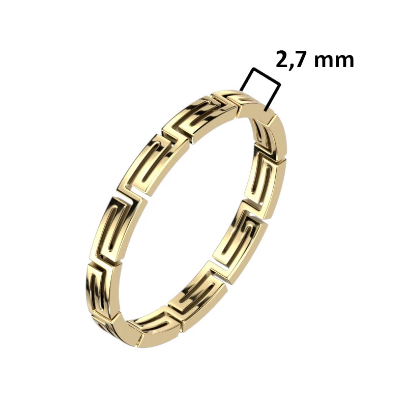 Ocelový prsten z chirurgické oceli. Prsten je po celém svém obvodu dekorován motivem řeckého klíče